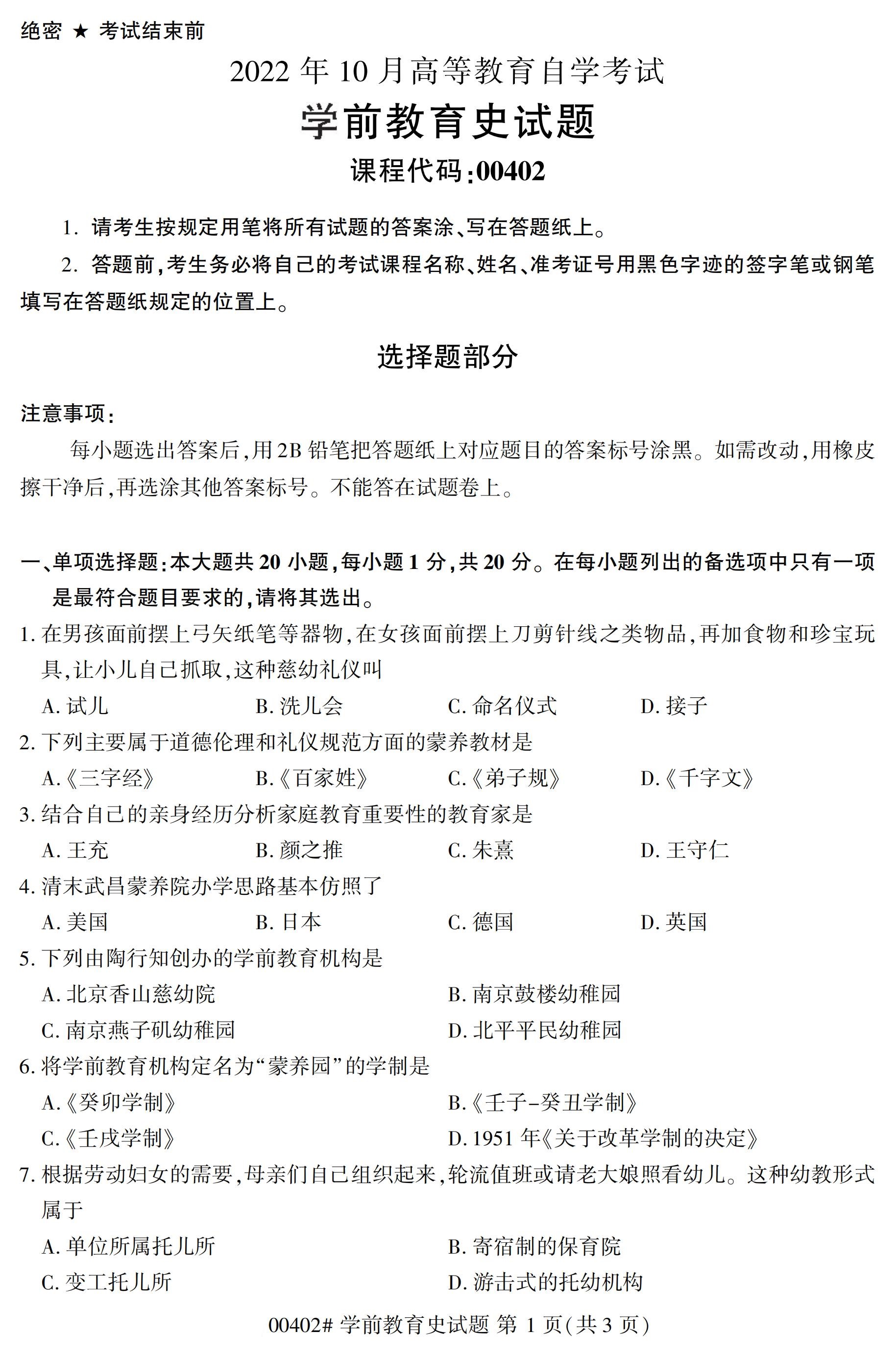 所在位置:安徽自考服務網(wǎng) > 安徽自考試題題庫 > 安徽自考歷年真題 > 2022年10月高等教育自學考試學前教育史00402試題